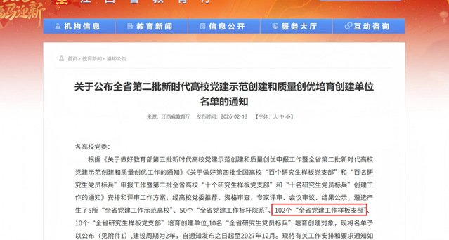 近日,中共江西省委教育工委公布了全省第二批新时代高校党建工作样板支部培育创建单位名单,我校马克思主义学院学生党支部凭借扎实的党建工作成效成功入选,跻身全省 102 个培育创建单位之列,成为全省高校基层学生党建工作的标杆与示范。
